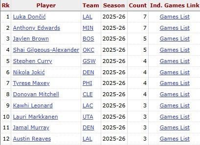 以下为本赛季单场得分40+次数的前10榜单(网站最新数据今日还未更新):