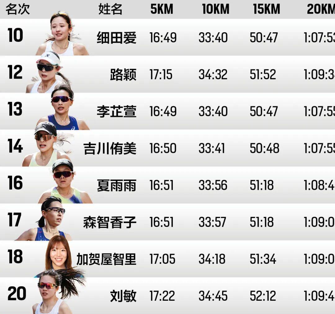 日本女子名将细田爱在本次东京马拉松后正式结束职业生涯。她以2小时23分39秒的成绩获得女子组第10名,位列日本选手首位。细田爱是日本马拉松界的代表人物,本次比赛是她的“最后一舞”。她从起步阶段就处于女子追逐集团,半程用时1小时11分36秒,最终以稳定表现完成谢幕战。比赛中,细田爱与李芷萱等处于女子第二集团,前5公里用时约在16分49秒,10公里用时33分39秒左右,15公里用时50分47秒,30公里用时1小时41分55秒,排在第13位,最终以稳健战术排在第10位完成比赛。